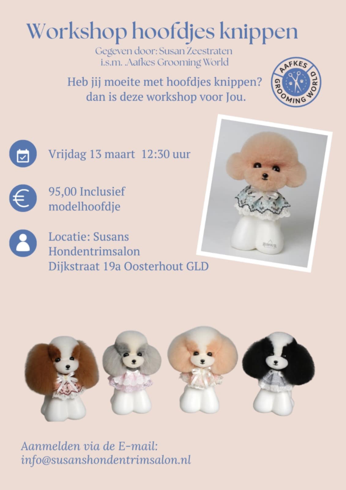 Demo/Hands-on Duur van de workshop: 10.00 tot 16.00 uur Wat zijn de kosten? 200,00 euro. Inclusief: Koffie, thee, lekkernijen en lunch In de ochtend krijg je uitgebreide uitleg over het perfect trimmen van de Schnauzer, inclusief materialen, technieken, lijnen, symmetrie, enzovoort. Na de lunch ga je zelf aan de slag met je hond. (We hebben ... Verder lezen...